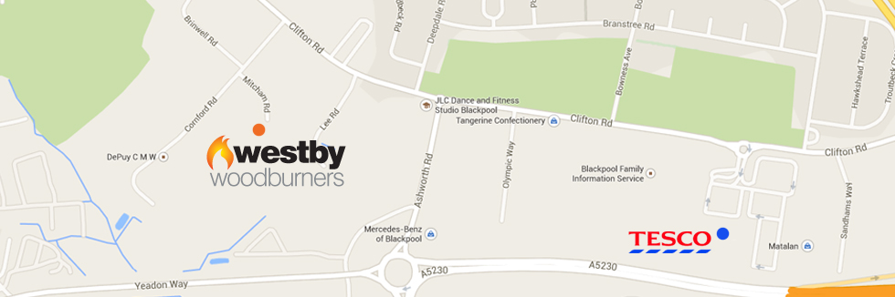 FROM M55 Follow the M55 to the end which turns into the A5230 at the roundabout turn right keeping Mercedes Benz on your right. Go past Feblands to the mini roundabout turn left, take the second left which is immediately after Volks Serv, which is Cornford Road. Once on Cornford Road take first left on to Mitcham Road passing Casdons on the left, drive to the end of the cul-de-sac and Westby Woodburners will be in front of you. FROM ASDA Drive past Asda so that it is on your left hand side. At the traffic lights go straight ahead, take the second turning on your right which is Cornford Road. Once on Cornford Road take first left on to Mitcham Road passing Casdons on the left, drive to the end of the cul-de-sac and Westby Woodburners will be in front of you. |